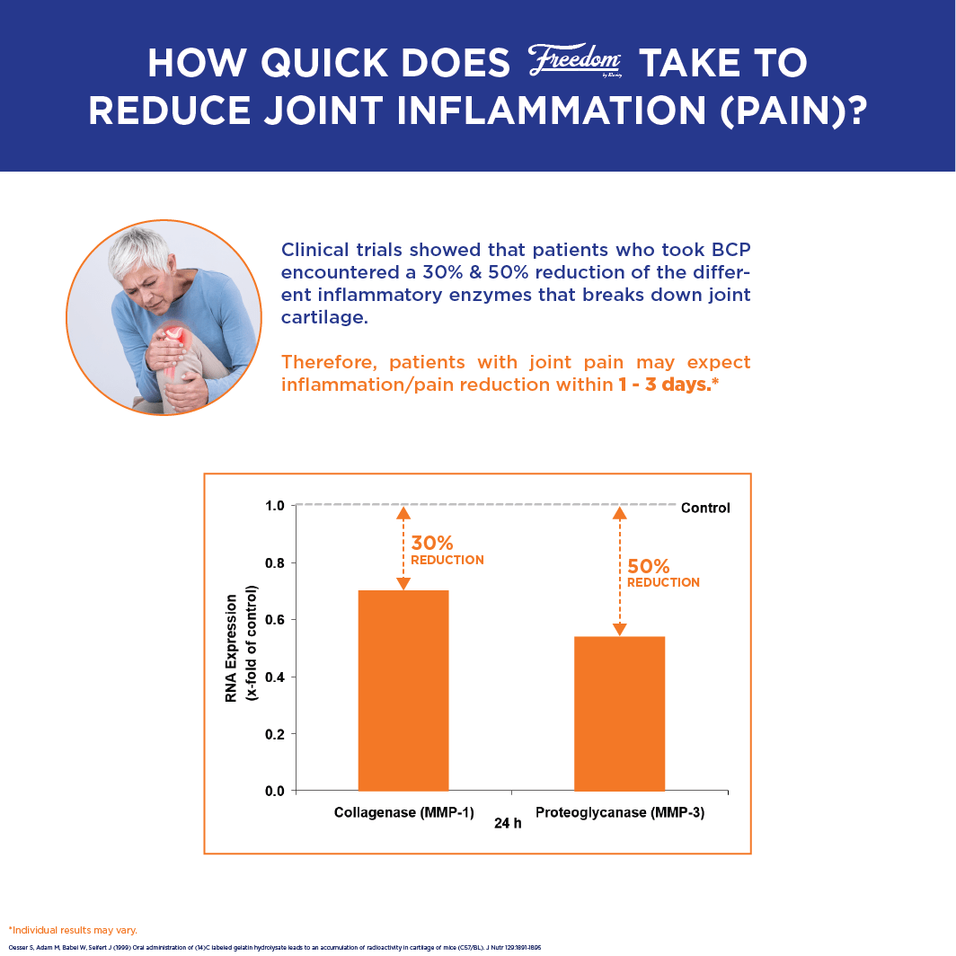 An overall of 70% of consumers had a positive effect from Freedom by KlaritySG™ Bioactive Collagen Peptides®. Thus, Freedom by KlaritySG™ Bioactive Collagen Peptides® will be an effective therapeutic approach for those suffering from joint pain and discomfort, low bone mass density and loss of mobility.